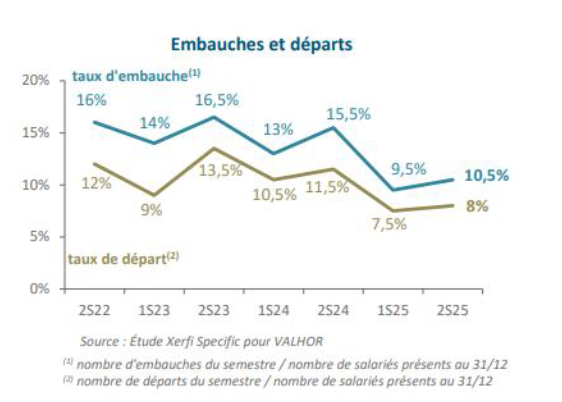 Signe encourageant, la part des entreprises déclarant avoir rencontré des difficultés de recrutement recule nettement, passant à 27 % au second semestre 2025. Pour autant, les intentions d’embauche pour les six prochains mois diminuent : 46 % des entreprises prévoient de recruter, contre 63 % au semestre précédent, traduisant une plus grande prudence face aux incertitudes économiques.
