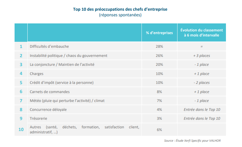L’instabilité politique et la réduction des budgets publics constituent désormais la première source d’inquiétude. S’y ajoutent les tensions sur le pouvoir d’achat des ménages, les conditions météorologiques défavorables et la contraction progressive des carnets de commandes